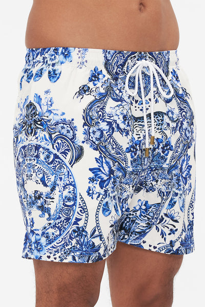 The Glaze And Graze Mid Length Boardshort is a rhapsody of Delft blues and porcelain whites. This Hotel Franks By CAMILLA luxury men's swim shorts are meticulously crafted from 100% recycled polyester. These boardshorts are both stylish and sustainable. The elasticated drawstring waist ensures a comfortable and adjustable fit. With secure zip pocket functionality conveniently store your essentials while enjoying your beach or poolside adventures. The tapered fit creates an effortlessly relaxed silhouette. .